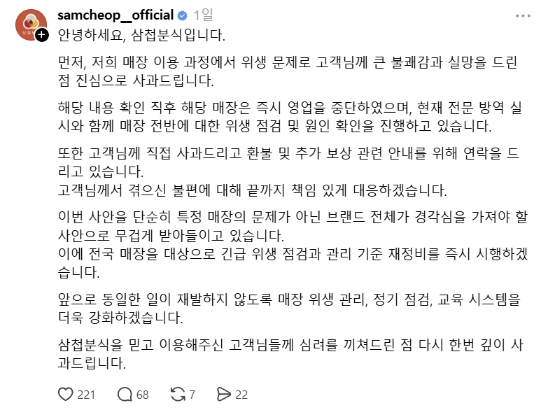 앞서 SNS 중 하나인 스레드에는 삼첩분식 떡볶이에서 바퀴벌레가 나왔다며, 떡볶이 값만 환불받았다는 내용의 글이 올라왔다.