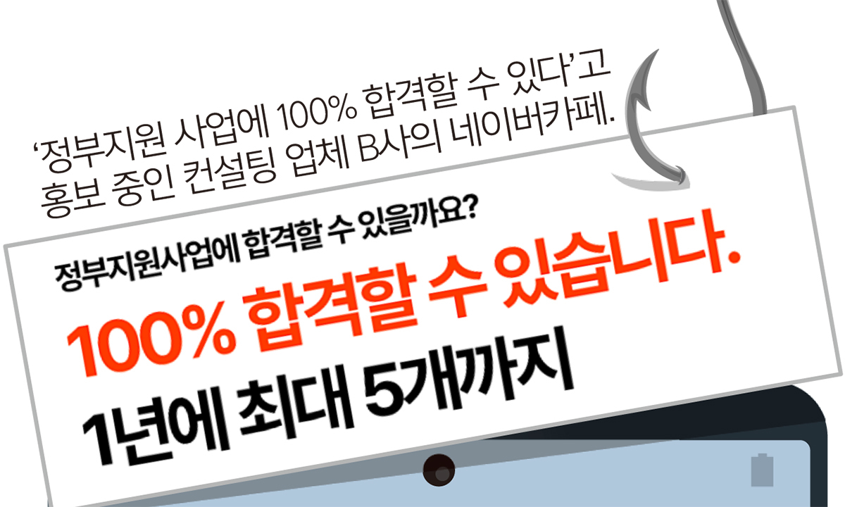 지난해 5월 첫 사업을 접고 새 사업을 시작하려던 이모(33)씨는 정부지원사업 컨설팅업체 A사 관계자로부터 이런 제안을 받았다. 600만원만 내면 사업아이템 발굴부터 특허출원, 정부지원사업 선발까지 평생 ‘풀케어’ 해주겠다고 했다. 특히 ‘100% 합격 보장’, ‘수강생 전원 2억원 이상 수령’이라는 A사 카페 광고글과 성공 사례 등이 신뢰를 줬다. 그러나 계약 후 무성의한 컨설팅, 리뷰 조작 정황, 계속된 서류 탈락 등에 믿음은 분노로 바뀌었다. 이씨는 현재 자신과 같은 피해자를 모으고, 사기 및 과장광고 등으로 각종 기관에 신고하고 있는 상황이다.